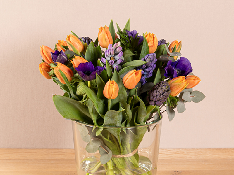 Rond paars/oranje boeket met echte voorjaarsbloemen, waaronder tulpen.